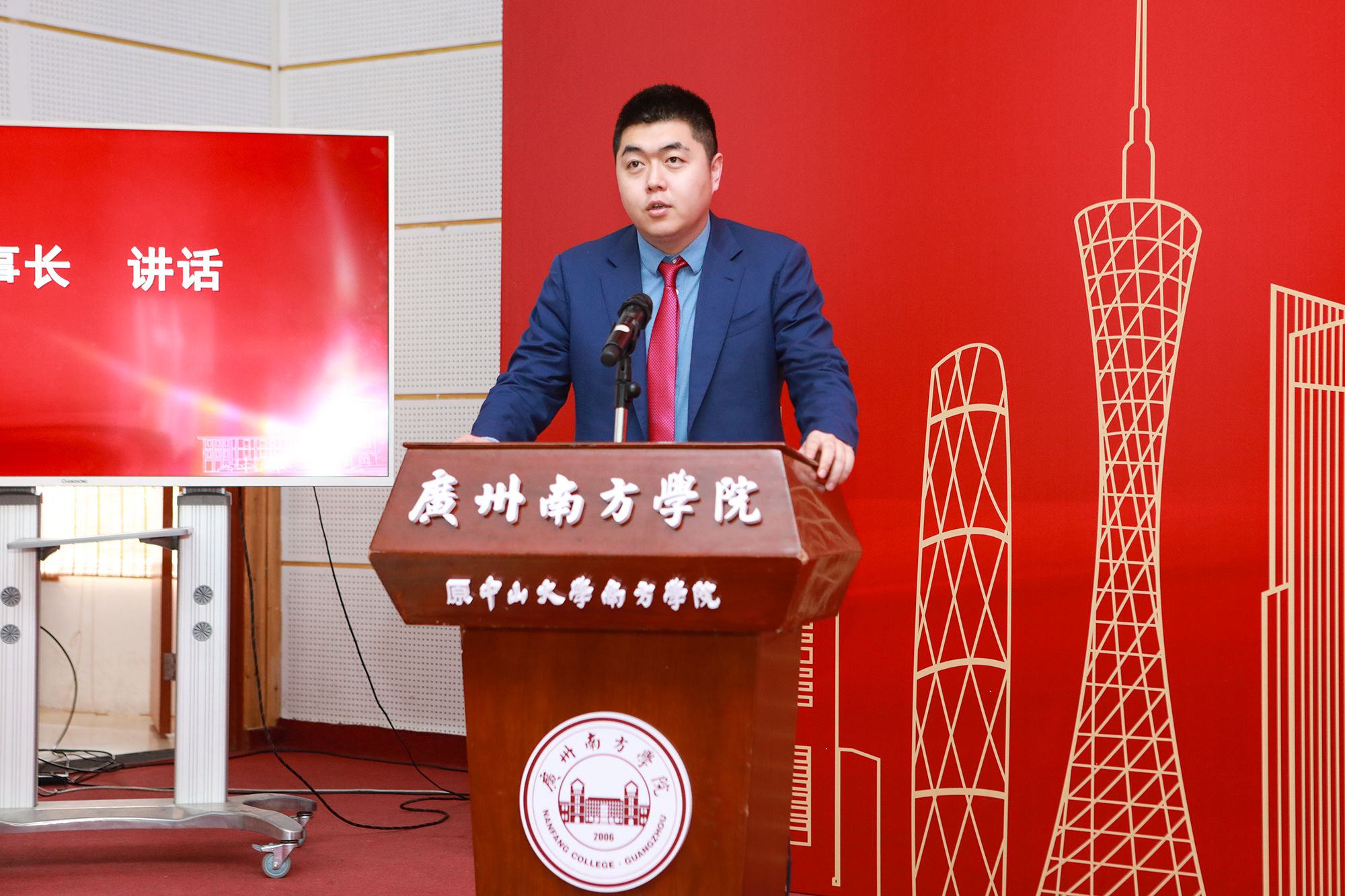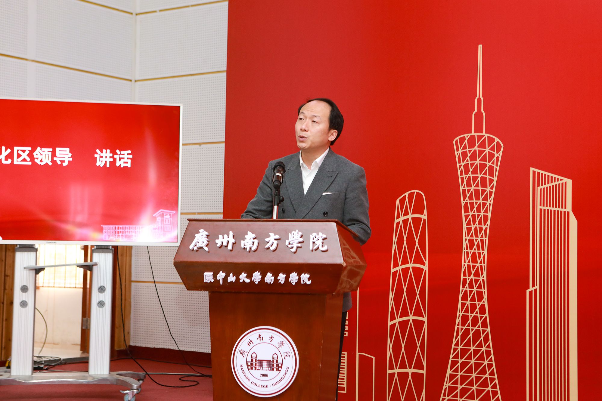 广州市从化区委常委、统战部部长孙柱致辞。他说,南方学院建校15年以来,在省教育厅的领导、中山大学支持、投资方的不断努力下,通过深化教育教学改革,加强师资队伍建设,积极搭建育人平台,不断推动政校协同育人,构建产教融合矩阵,取得丰硕的办学成果。培养的毕业生深受用人单位好评,社会认可度高,在社会上享受较高的声誉。学校立足于粤港澳大湾区,积极服务地方经济,参与推动从化区经济转型升级,为从化区经济发展贡献了卓有成效的力量。对此,从化区委、区政府对学校表示衷心感谢。