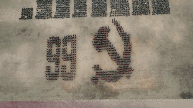 花样表演方阵的同学们口号嘹亮,步履铿锵,摆出“不忘初心、牢记使命”等造型并高呼“听党指挥,能打胜仗,作风优良。”