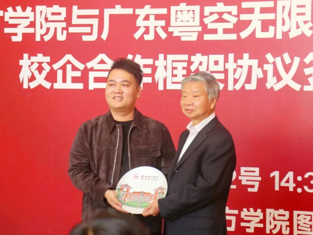 李建超书记代表学校向广东粤空无限国际贸易有限公司赠送上了纪念品,表达对合作的美好祝福。