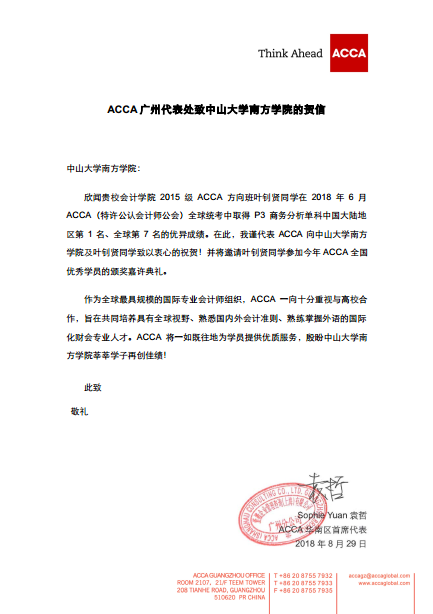 近日,会计学院收到2封来自ACCA广州代表处的祝贺信,其对会计学院ACCA方向班学子取得的优异成绩进行了祝贺,更高度肯定了会计学院ACCA方向班的办学成果。