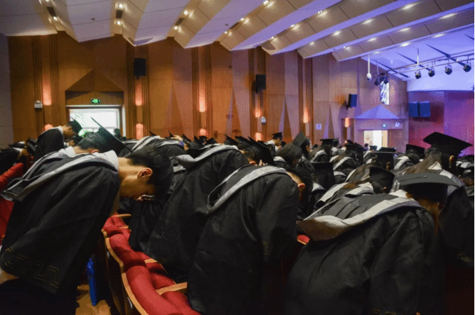 黄静波副校长宣布学位授予仪式礼成,全体毕业生向父母和老师鞠躬致谢,行感恩礼。毕业训词犹然在耳,学位授予仪式至此圆满礼成。