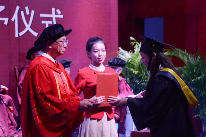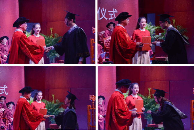 在庄严隆重的氛围中,执权杖教授何兴强恭请校长喻世友教授颁授学位。主持人宣读学位授予名单,而台下老师细心为每位即将登台的同学整理衣冠、拨正流苏。现场毕业生们依次登台,从喻世友校长手中接过学士学位证并致谢。主礼教授喻世友微笑着给每一名毕业生送上学位证书、一一与他们亲切握手。与校长庄重握手、学位帽上的流苏从右拨到左后,各位毕业生们的本科求学之旅也将画上圆满的句号。
