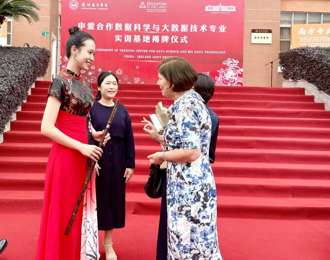 图书馆前,南方学院师生为安黛文大使一行献上国乐合奏《象王行》、长笛吹奏爱尔兰名曲《Down By the Salley Garden》及国风舞《漫步青绿图》等表演并以书法展示祝福中爱友谊长青。