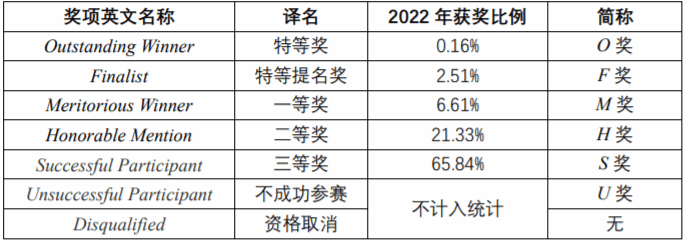 据悉,美国大学生数学建模竞赛是由美国数学及其应用联合会主办,始于1985年,是国际顶级学科竞赛之一,是现今各类数学建模竞赛的鼻祖。竞赛要求三人为一组,在四天时间内,就指定的问题完成从建立模型、求解、验证到论文撰写的全部工作,体现参赛选手研究问题、解决方案的能力及团队合作精神,是学生实践创新能力的综合体现。本届大赛吸引了来自中国、美国、澳大利亚、加拿大、英国等80多个国家与地区的众多顶级高校在内的27205支队伍参加,经过层层选拔和评选,最终获奖比例如下: