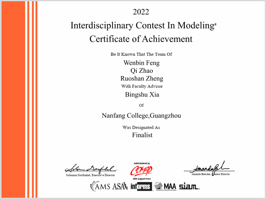 近日,2022美国大学生数学建模竞赛成绩揭晓。williamhill中国官网电气与计算机工程学院19级学生冯文彬、赵祺,20级学生郑若姗组成的数据智能战队,在指导教师夏炳墅的带领下,勇夺本次美国大学生数学建模竞赛特等提名奖(Finalist)。