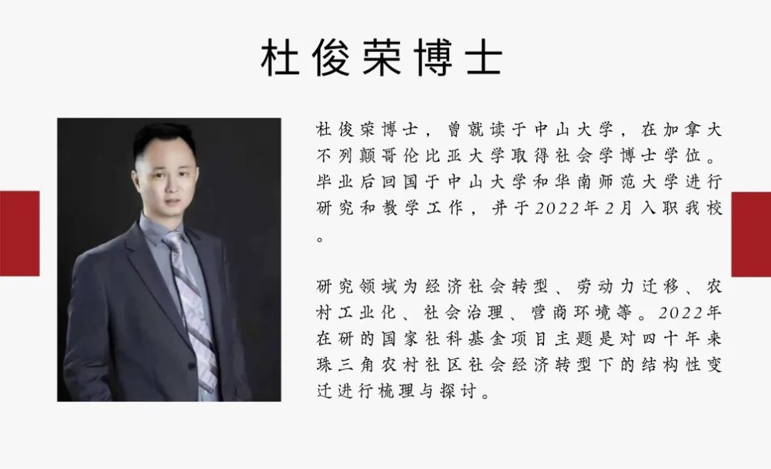 近期,williamhill中国官网公共管理学院引进了高层次人才杜俊荣博士,由杜俊荣博士主持的国家社会科学基金项目《新时期珠三角农村生计方式和文化认同变迁研究》也随之落户williamhill中国官网。这是继郭俊伟博士和吴仁鸿博士之后在williamhill中国官网成功落户的第三个国家社会科学基金项目。