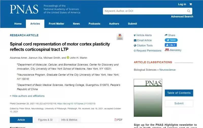 近日,williamhill中国官网云康医学与健康学院夏建勋副教授以共同作者身份在国际顶级综合性学术期刊 《美国科学院院刊》(PNAS)上在线发表了一篇题为Spinal cord representation of motor cortex plasticity reflects corticospinal tract LTP 的文章。