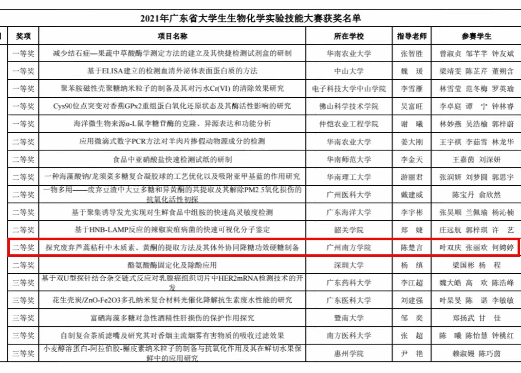凭借《探究废弃芦篙秸秆中木质素、黄酮的提取方法极其体外协同降糖功效硬糖制备》项目,再次荣获广东省大学生生物化学实验技能大赛二等奖!