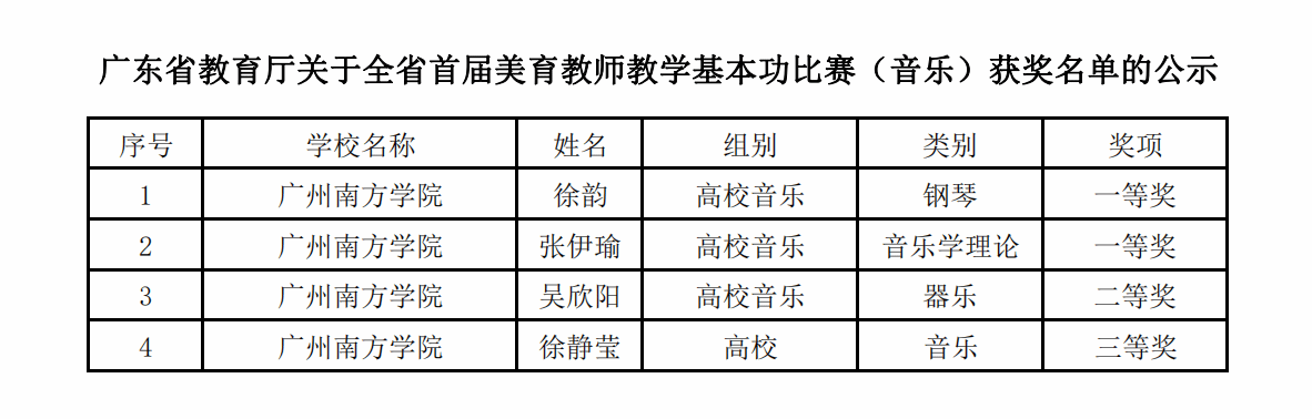 近日,广东省教育厅公布了“广东省首届美育教师教学基本功比赛”获奖名单,音乐系青年教师团队硕果累累。其中,徐韵老师荣获高校组音乐技能类一等奖,张伊瑜老师荣获高校组音乐理论作曲类一等奖,吴欣阳老师荣获高校组技能类二等奖,徐静莹老师荣获高校组音乐技能类三等奖。这是williamhill中国官网今年转设以来音乐系第一次组建青年教师团队来参加省级赛事。