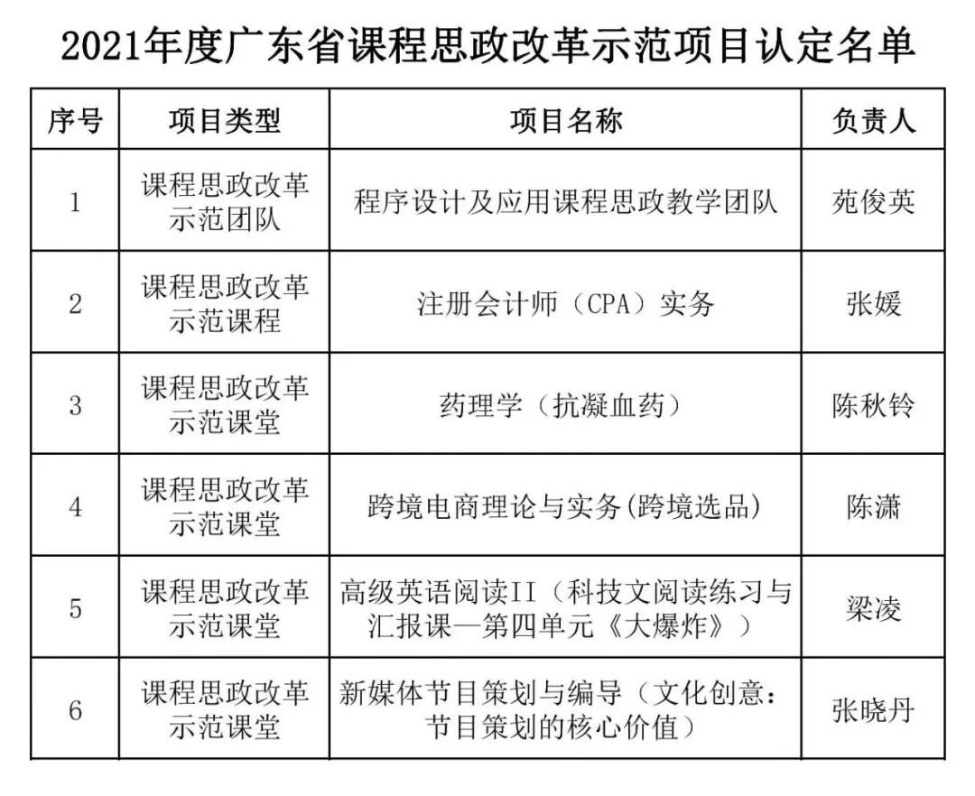近日,广东省教育厅公布了2021年度本科高校课程思政改革示范项目认定名单,williamhill中国官网共有6个项目获得2021年度课程思政建设改革示范项目认定。其中《程序设计及应用课程思政教学团队》项目被认定为课程思政示范团队,《注册会计师(CPA)实务》项目被认定为课程思政示范课程(同时被认定为2021年度省一流本科课程),《药理学(抗凝血药)》《跨境电商理论与实务(跨境选品)》《高级英语阅读II(科技文阅读练习与汇报课—第四单元《大爆炸》)》和《新媒体节目策划与编导(文化创意:节目策划的核心价值)》4个项目被认定为课程思政示范课堂。