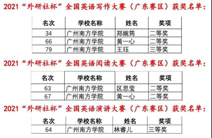 11月6日至7日,大学英语教学中心李碧慧和谢思晨老师带领9位同学参加了2021年外研社·国才杯全国英语演讲、写作、阅读大赛广东赛区复赛,在强手如林的比赛中取得优异成绩。其中郑婉筠、黄一心、区思莹三位同学在写作及阅读大赛中共获得四个二等奖(黄一心同学同时获得写作和阅读比赛二等奖),王钰、林睿儿分别获得写作及演讲大赛三等奖。