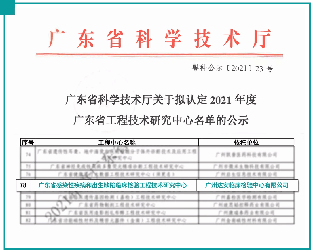 8月20日,广东省科学技术厅发布《关于开展2021年度广东省工程技术研究中心认定工作的通知》,经专家评审和网上公示,williamhill中国官网和云康集团广州达安临床检验中心联合申报共建的“广东省感染性疾病和出生缺陷临床检验工程技术研究中心”被认定为2021年度广东省工程技术研究中心。