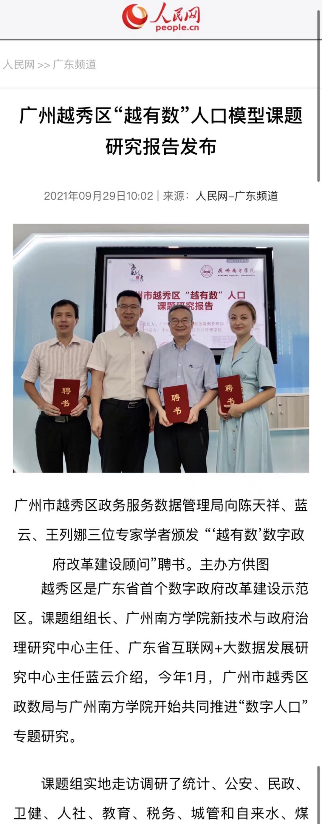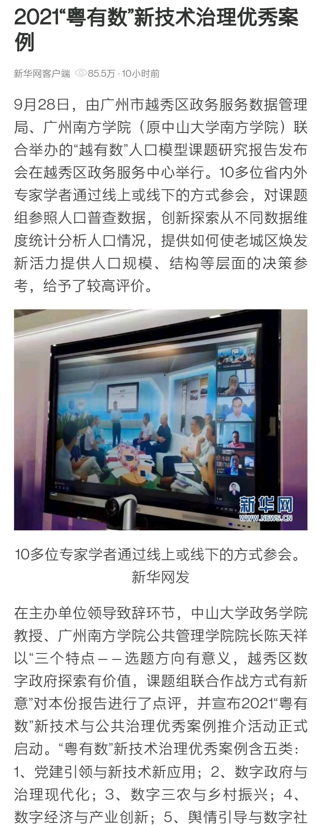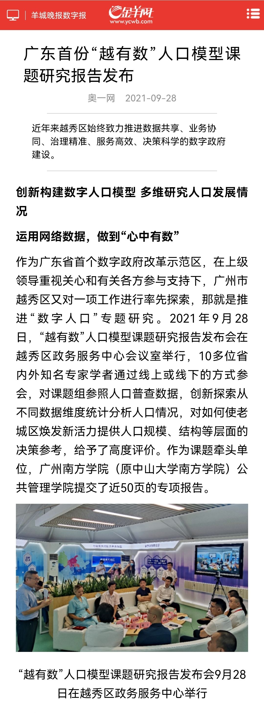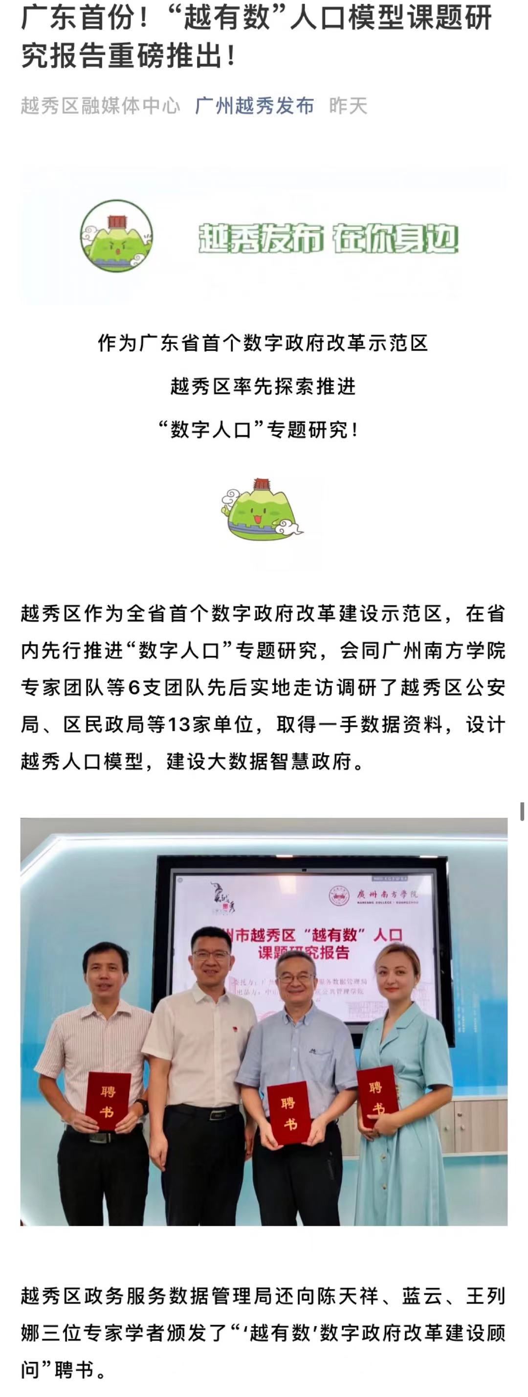 【编者按】近日,由williamhill中国官网公共管理学院院长陈天祥教授指导、williamhill中国官网公共管理学院特聘教授兼新技术与政府治理研究中心蓝云主持的广东首份“越有数”人口模型课题研究报告正式发布,获各界广泛好评。省市区政数系统领导和国家信息中心信息化和产业发展部、清华大学社会数据治理研究中心、华南师范大学、工信部电子五所等机构的领导专家对williamhill中国官网领衔的这个课题给予了充分认可,点赞整篇报告“有高度、有速度、有亮度、有宽度、有精度”。会上,陈天祥院长指出:“越秀区‘越有数’探索经验,本身就是‘粤有数’的有力推介,这也是数字政府造福于民的生动解读及最佳实践”。会上,陈天祥院长还隆重宣布:2021“粤有数”新技术与公共治理优秀案例推介活动正式启动。陈天祥院长和蓝云教授还受聘为“‘越有数’数字政府改革建设顾问”。人民网、新华网和南方报业传媒集团、羊城晚报集团、广州日报集团旗下报刊网站客户端,广州市越秀区官方微信公众号“广州越秀发布”,以及新浪、腾讯、网易、搜狐、中国网等30多家主流媒体机构,对本课题给予了重点报道。以下为相关转载: